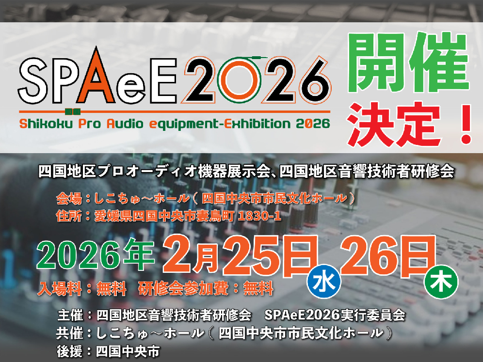 2026年2月25日(水)よりしこちゅ~ホール(愛媛県)にて開催されるSPAeE2026 四国地区プロオーディオ機器展示会に出展いたします。